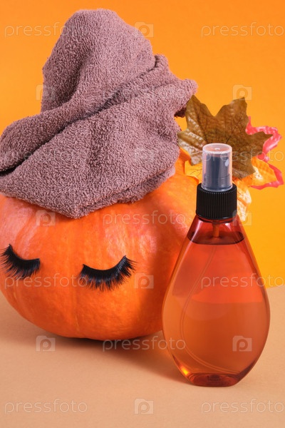 Макет косметического спрея и тыквы с полотенцем и накладными ресницами на бежевом фоне, уход за волосами и кожей лица осенью