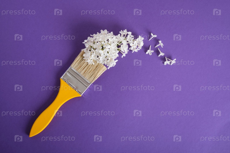 Деревянные желтые кисти и белые цветы сирени на темно-фиолетовом фоне