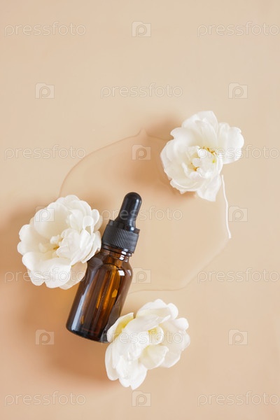 Концепция масла шиповника. Коричневая стеклянная бутылка-капельница и цветок шиповника