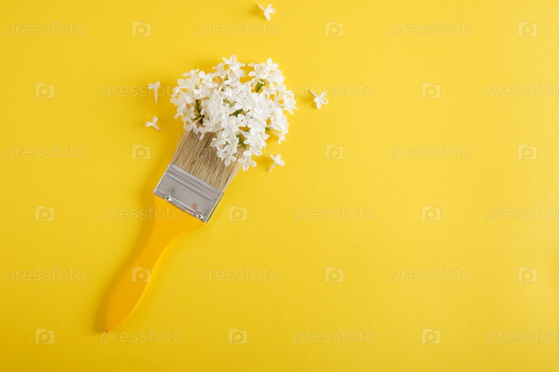 Деревянные желтые кисти и белые цветы сирени на желтом фоне