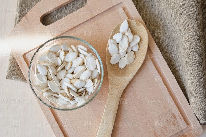 Семена тыквы в белой миске и ложка на льне на столе для копирования