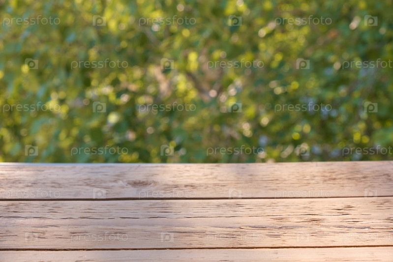 Поверхность деревянной доски на зеленом естественном фоне копировального пространства, летний солнечный свет
