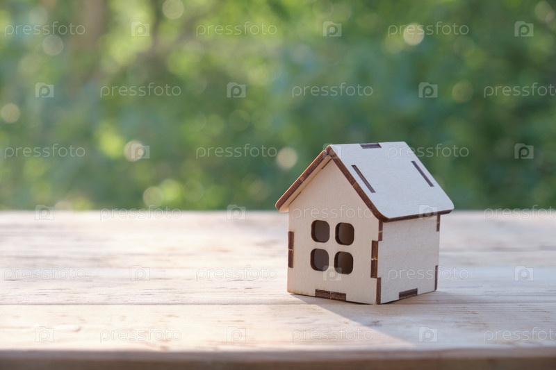 Небольшая домашняя модель на деревянном столе с природой зеленый боке абстрактный фон