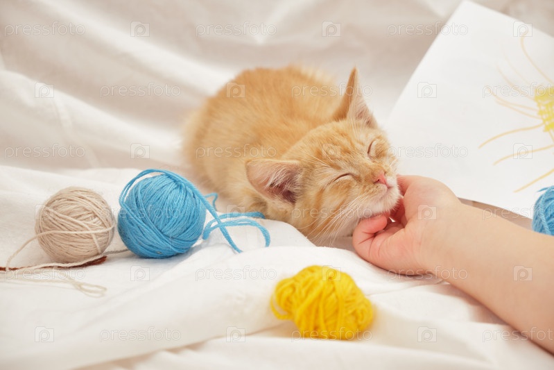 Маленькая рука ребенка и рыжий котенок, лежащий на кровати, концепция ухода за домашними животными. кот и клубки ниток на белой ткани