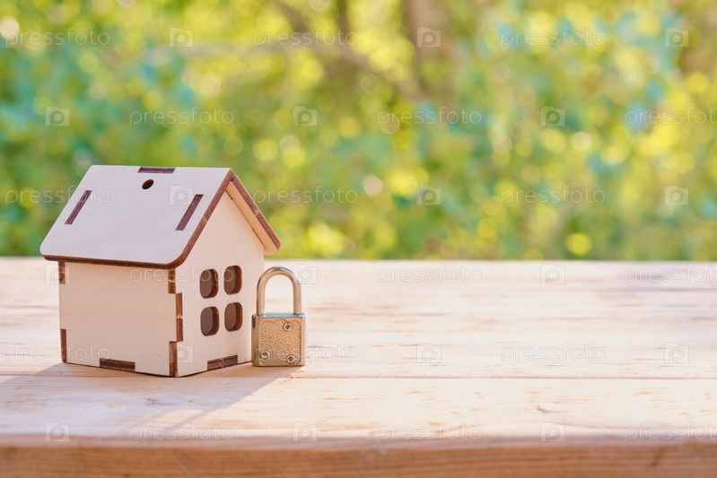 Концепция домашней безопасности: Деревянный модельный дом и замок на деревянной поверхности