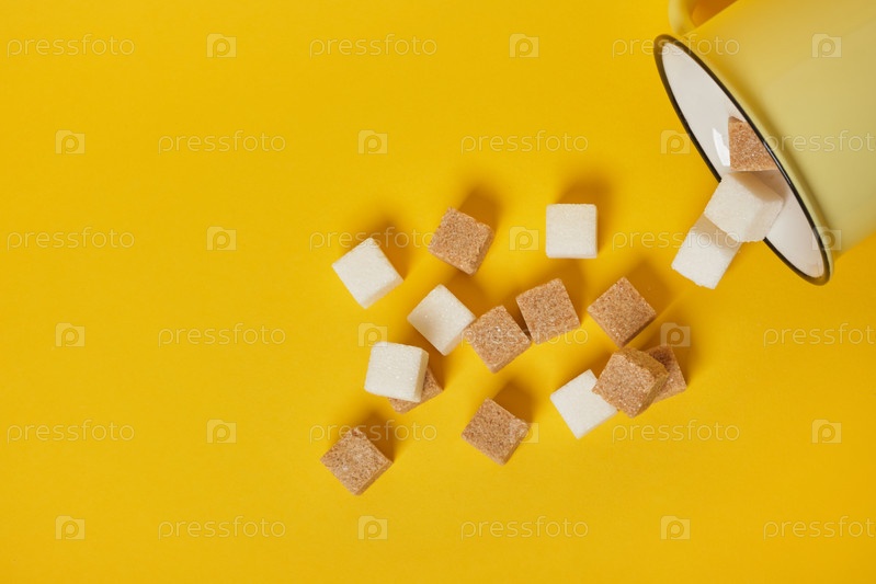 Кубики тростникового коричневого и белого сахара выпали из желтой чашки на желтом фоне
