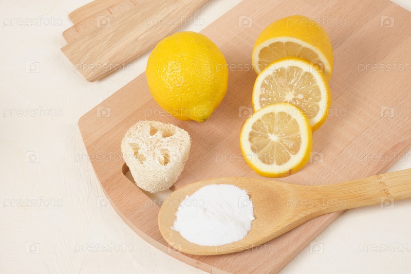 Люффа, лимон и пищевая сода на деревянной ложке, вязальная доска на бежевом фоне