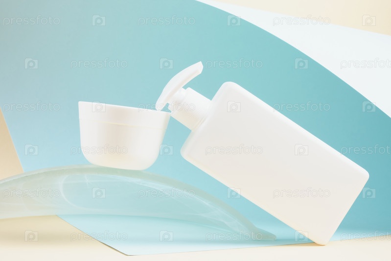 Белая кремовая банка и бутылка с дозатором без этикетки на синем фоне, стеклянный подиум на голубом фоне, макет косметической упаковки