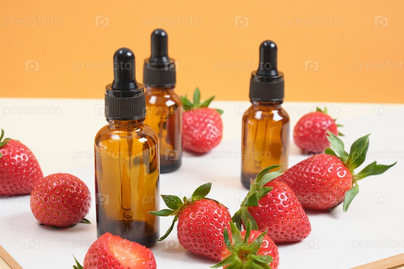 Коричневая стеклянная бутылка косметического масла, хлопковые многоразовые губки для лица и красная клубника на фоне серой плитки, бежевый фон