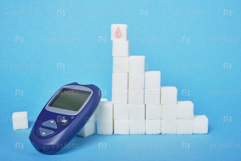 Устройство для измерения уровня глюкозы в крови и кубики сахара на синем фоне