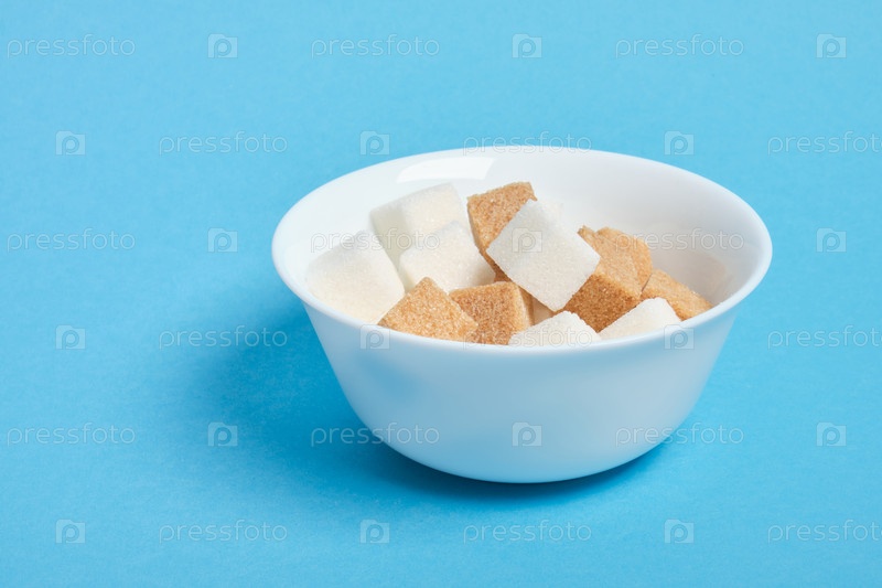 Кубики коричневого и белого сахара в белой миске на синем фоне