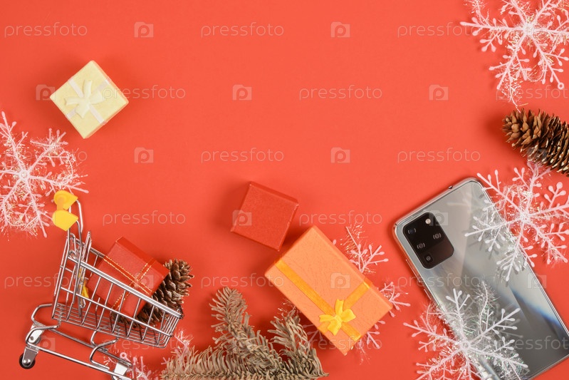 Корзина и смартфон с тремя камерами, рождественский декор на красном фоне, подарочные коробки, снежинки и телефон, рождественские и новогодние скидки и концепция подарков