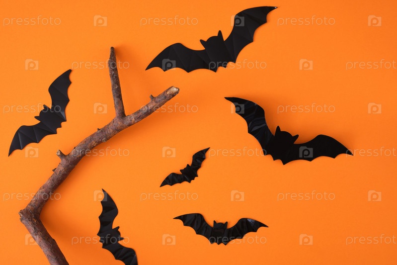 Ветка и декоративные черные летучие мыши на оранжевом фоне, фон хэллоуина