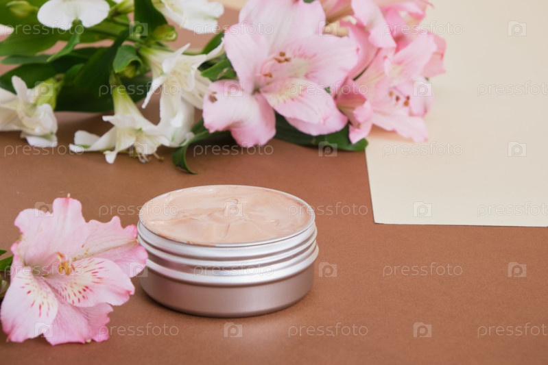 Алюминиевая банка косметического крема и красивые розовые и белые цветы лилии на бежево-коричневом фоне