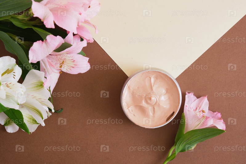 Пустой макет алюминиевой открытой косметической банки с кремом с маской из розовой глины и красивыми розовыми и белыми цветами лилии на бежево-коричневом фоне вид сверху