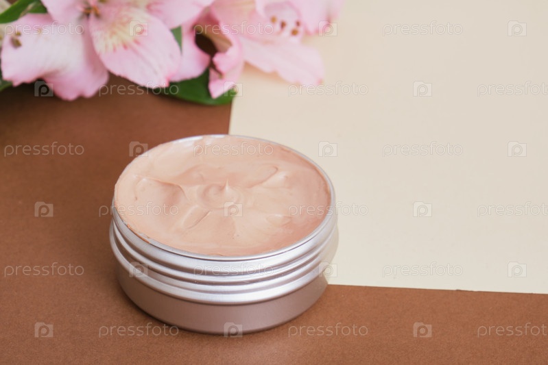 Пустой макет алюминиевой открытой косметической банки с кремом с маской из розовой глины и красивыми розовыми и белыми цветами лилии на бежево-коричневом фоне вид сверху