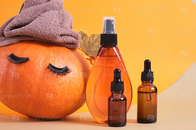 Макет набора косметических контейнеров с пипетками из янтарного стекла и тыквы с полотенцем и накладными ресницами на оранжевом фоне, натуральный уход за кожей в осенней концепции