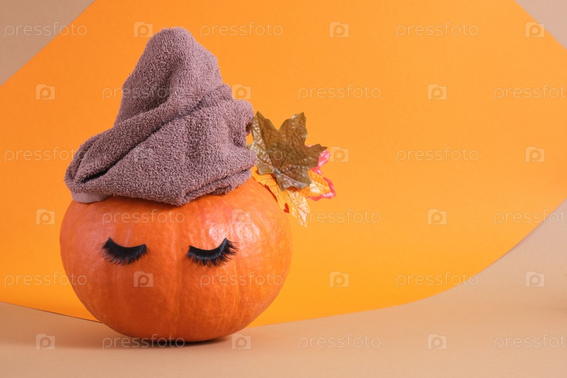Оранжевая тыква с полотенцем и накладными ресницами на оранжевом фоне копия пространства осенняя концепция ухода за кожей копия пространства