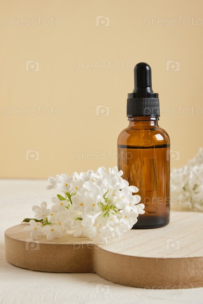 Коричневая бутылка с капельницей для косметических масел или сывороток и веткой белой сирени на бежевом фоне