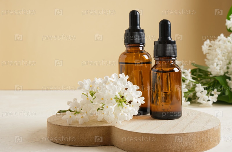 Коричневая бутылка с капельницей для косметических масел или сывороток и веткой белой сирени на бежевом фоне