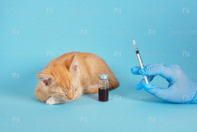 Рука в перчатке держит инсулиновый шприц, спящего милого рыжего котенка и лекарство в бутылке для инъекций на синем фоне, концепция вакцинации животных и лечения