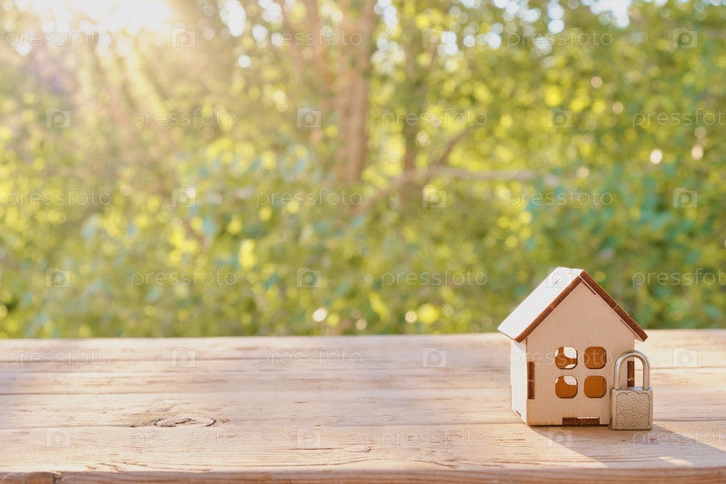 Концепция домашней безопасности: Деревянный модельный дом и замок на деревянной поверхности. домашняя безопасность