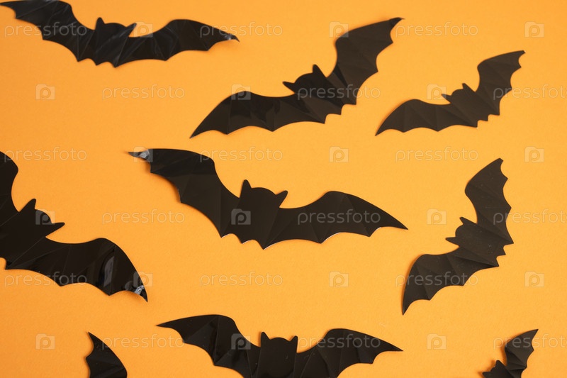 Черные летучие мыши на пустом оранжевом фоне, пространство для копирования концепции хэллоуина