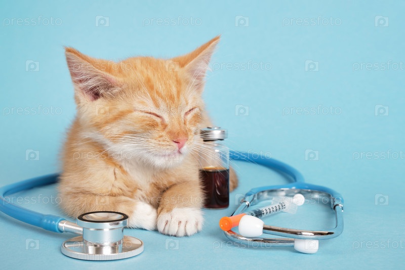 Спящий милый рыжий котенок, стетоскоп, инсулиновый шприц и лекарство в бутылочке для инъекций на синем фоне, концепция вакцинации и лечения животных, концепция ветеринарной клиники