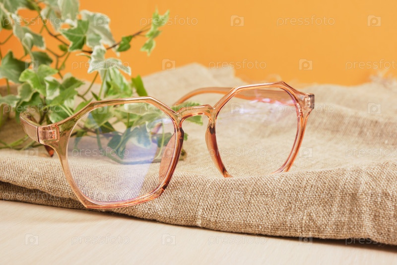 Стильные очки и листья растений на льняной ткани, коричневое пространство для копирования фона
