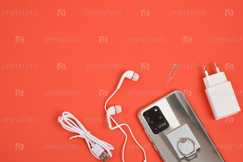 Современный смартфон с 3 камерами с металлическим корпусом и компонентами смартфона на красном фоне, вид сверху, пространство для копирования