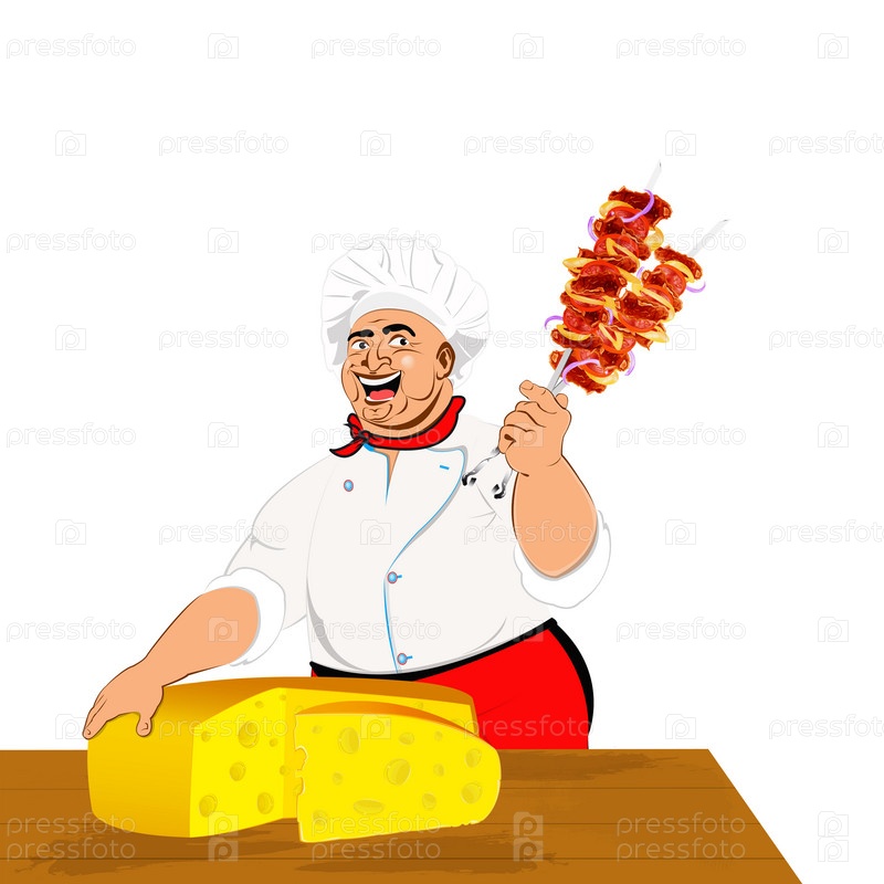 Шеф-повар и аппетитный традиционный кавказский шашлык со свежим молочным сыром на белом фоне
