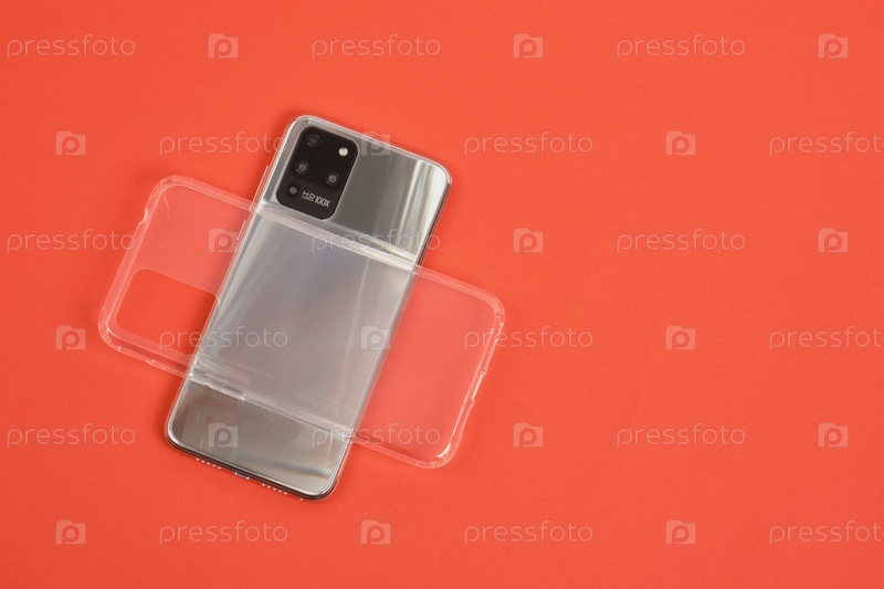 Современный смартфон с 3 камерами с металлическим корпусом и прозрачным силиконовым чехлом на красном фоне, вид сверху