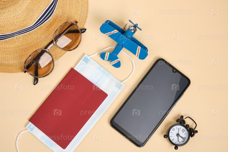 Паспорт шляпа солнцезащитные очки будильник и игрушечный самолет на бежевом фоне вид сверху плоская планировка защита от вируса короны