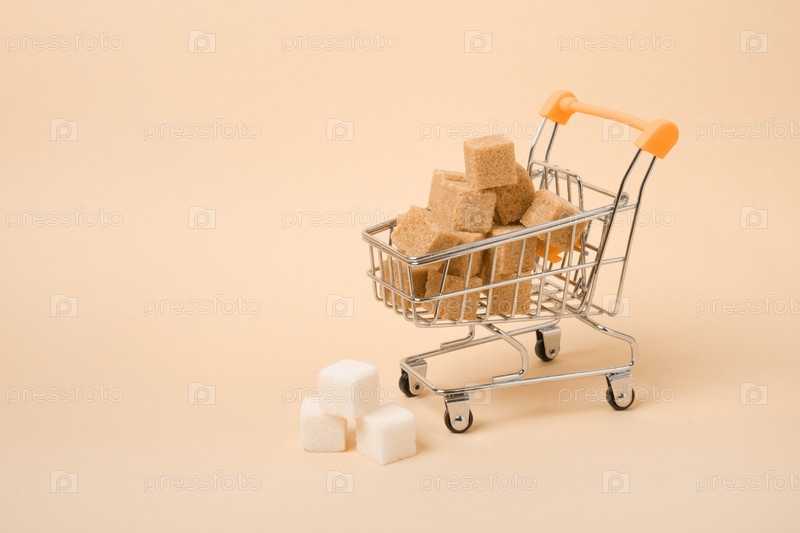 Кубики коричневого сахара в миниатюрной тележке для покупок на бежевом фоне, полезная и вредная концепция сахара, пространство для копирования
