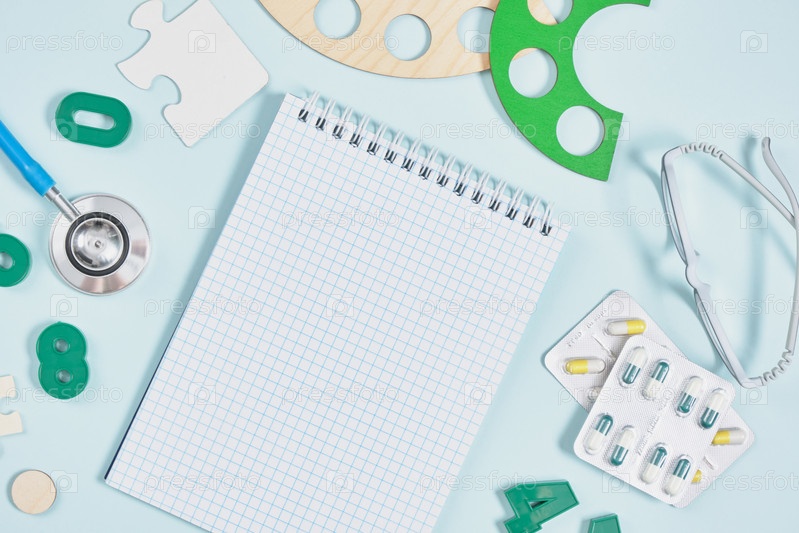 Блокнот, стетоскоп и развивающие игрушки на синем фоне, концепция диагностики детских заболеваний
