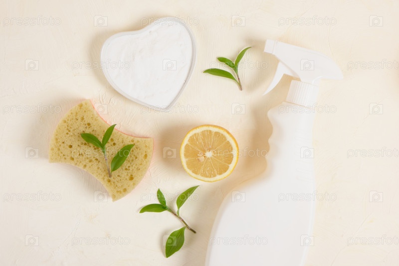 Бутылка с распылителем, губка, лимон и сода на бежевом фоне сверху копируют космическую тарелку с пищевой содой. нетоксичное моющее средство для уборки