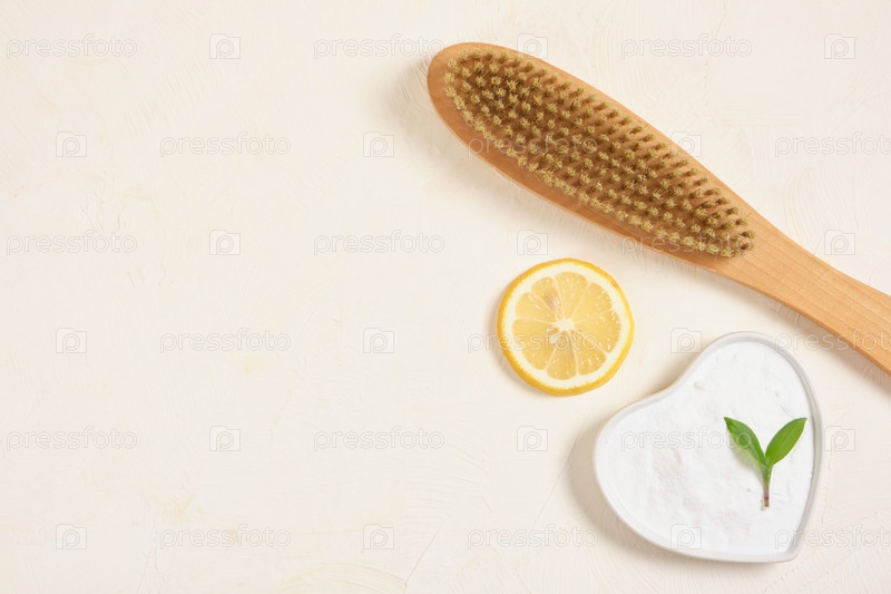 Деревянная щетка, губка, лимон и газировка на бежевом фоне