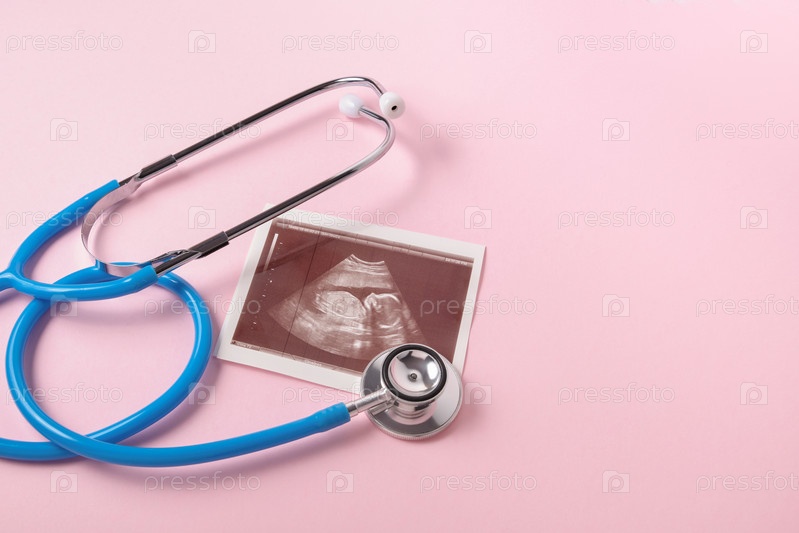 Медицинский стетоскоп и изображение эмбриона на розовом фоне