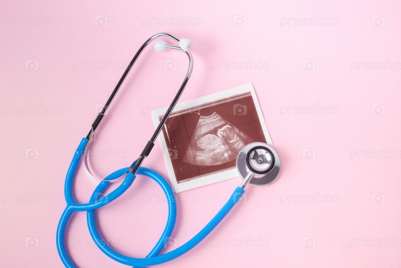 Медицинский стетоскоп и изображение эмбриона на розовом фоне