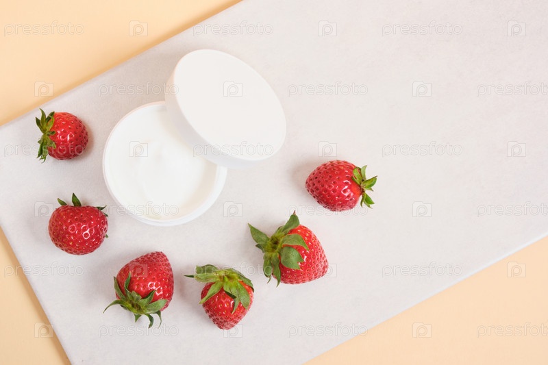 Открытая банка белого крема и клубника на бежевом и сером фоне