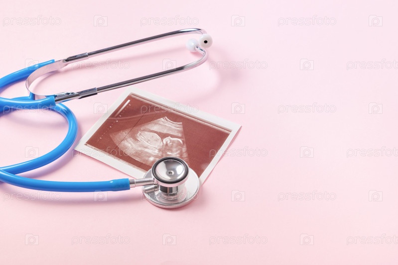 Медицинский стетоскоп и изображение эмбриона на розовом фоне