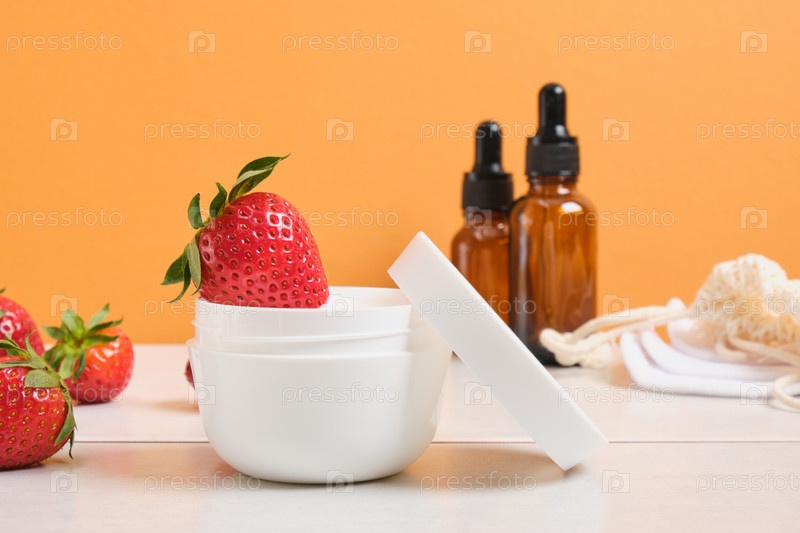 Открытая банка с белым кремом без этикетки и клубника на коричневом и сером фоне копией пространства макет коричневых бутылок для косметических масел на заднем плане