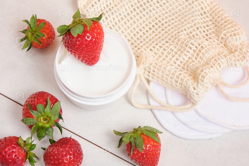 Хлопковые многоразовые губки для лица, крем в банке, белая и красная клубника на фоне серой плитки, бежевый фон