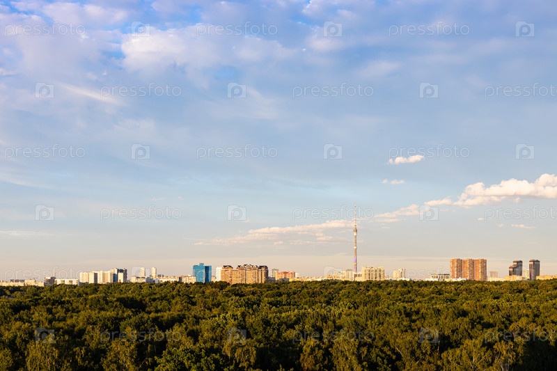 Парк и жилые дома на горизонте на закате