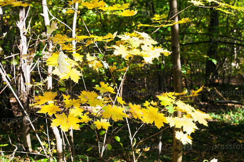 Желтые осенние кленовые листья, освещенные солнцем в лесу