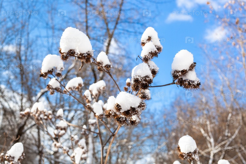 Свежий снег на головке лопуха крупным планом