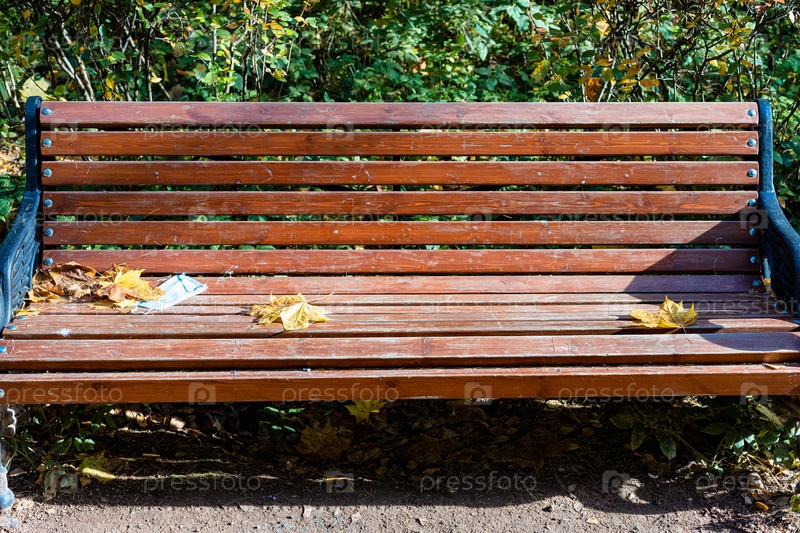 Вид спереди на деревянную скамью с использованной маской для лица