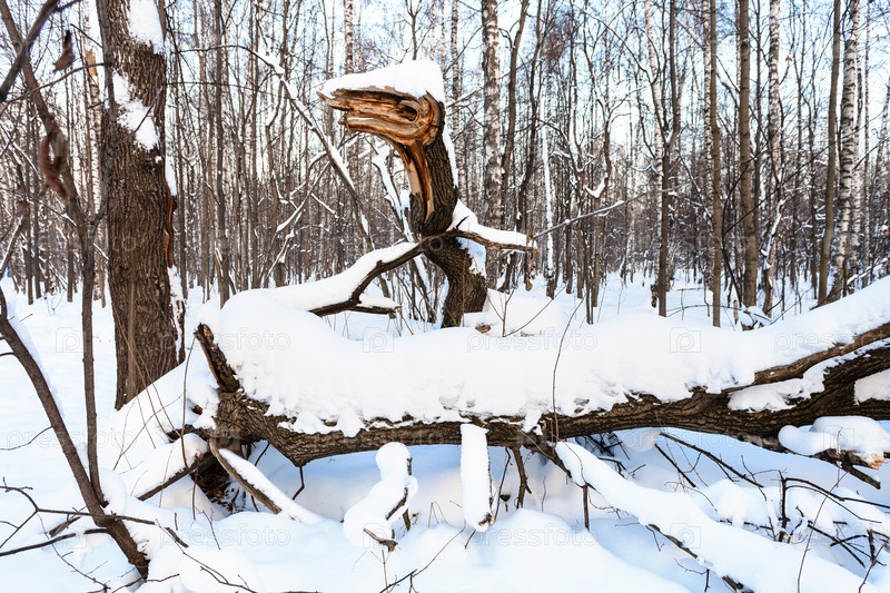 Сломанное дерево в форме сказочной змеи в лесу