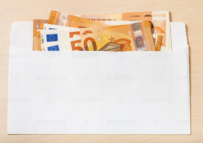 Несколько банкнот по пятьдесят евро в конверте на столе