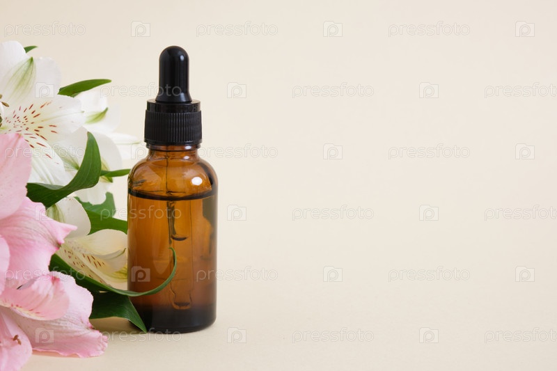 Бутылка из янтарного стекла с пипеткой на бежево-коричневом фоне с цветами лилии. копировать пространство. Натуральная косметика, концепция ухода за кожей